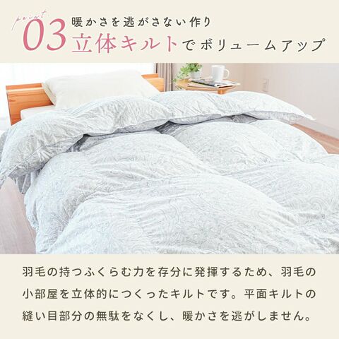 ダウン90%配合で軽くて暖かく、優れた保温性を発揮。冬でも暖かくなってきた現代にぴったりで、暑がりの方や高気密住宅・温暖な地域にお住まいの方にも最適。
