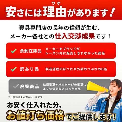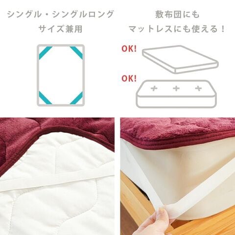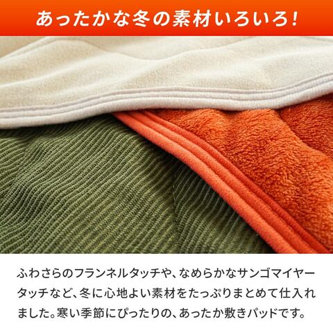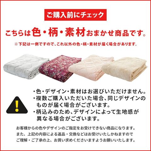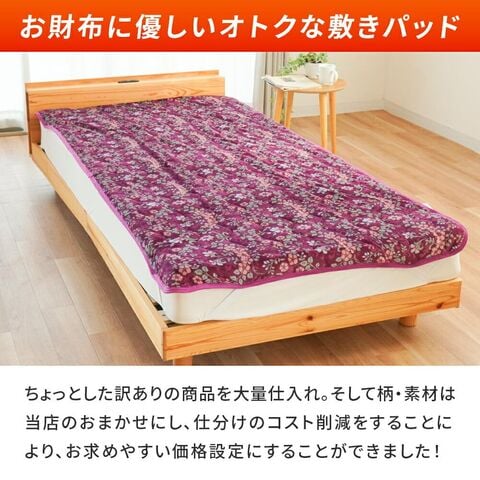 | ・お財布に優しい!訳ありだからこその価格設定 大量仕入れと仕分けのコスト削減により、驚きの低価格が実現しました。品質よりもコスパ重視の方にぴったり! ・あったか素材がいろいろ!冬に嬉しい手触りふわさらフランネルや、なめらかサンゴマイヤーなど、冬に心地良い素材をたっぷりまとめて仕入れました。寒い季節にぴったりの敷きパッドです。 ・便利な四隅ゴムバンド付きでズレにくい!マットレスや敷き布団にしっかり固定できる四隅ゴムバンド付き。寝返りをしてもズレにくく、着脱もラクラクです。 ・まとめ買いでさらにお得に!洗い替え用に複数枚持っておくと便利。まとめて買えば単品よりさらにお求めやすくなります♪ | |