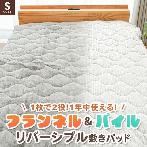| ・1年中使えるリバーシブルタイプ 保温性に優れたフランネル生地と通気性に優れたパイル生地の両面使えるリバーシブル敷きパッド。どちらも肌触りが良く、1年を通して快適な寝心地が続きます。 ・保温性抜群のフランネル生地片面はあたたかい保温性に優れたフランネル生地。しっとりとろけるような肌触りで、程よく起毛してふわり。冬の冷えた空気の中でも優しい使い心地です。 ・通気性抜群のパイル生地さわやかに使いたいときはさらっと通気性の良いパイル生地の面でご使用いただけます。ベタつきにくく、汗かきな方に特におすすめです。 ・ズレを防止する四隅ゴム付き敷きパッドの四隅には、お布団と敷きパッドを固定するゴムバンド付き。敷き布団にもマットレスにもお使いいただけるようになっています。 ・丸洗いできて、いつでも清潔汚れても洗濯機で手軽に洗えて、いつでも清潔にお使いいただけます。 ※お洗濯の際は必ず洗濯ネットを使用してください。 ※洗濯前にお使いの洗濯機の取扱説明書をご確認ください。 | |
