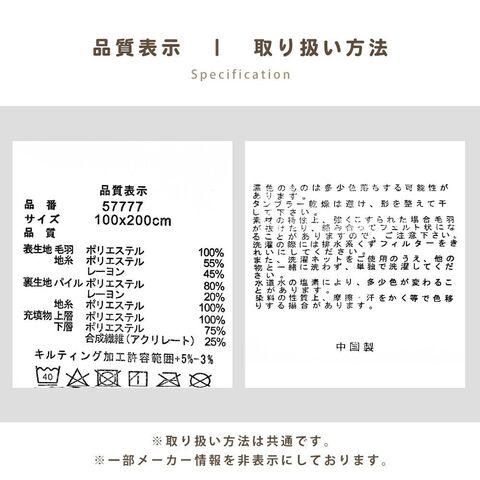 | サイズ | 約 100 × 200 cmキルティング加工許容範囲 ±5%~3% |