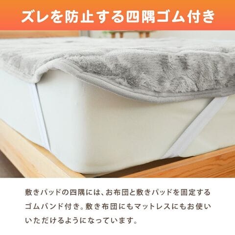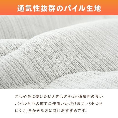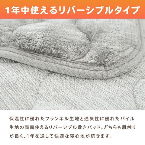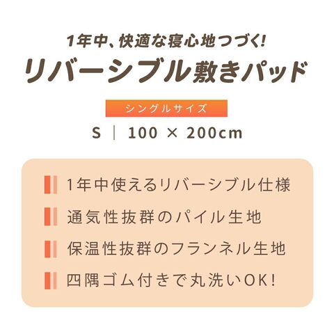 | ・1年中使えるリバーシブルタイプ 保温性に優れたフランネル生地と通気性に優れたパイル生地の両面使えるリバーシブル敷きパッド。どちらも肌触りが良く、1年を通して快適な寝心地が続きます。 ・保温性抜群のフランネル生地片面はあたたかい保温性に優れたフランネル生地。しっとりとろけるような肌触りで、程よく起毛してふわり。冬の冷えた空気の中でも優しい使い心地です。 ・通気性抜群のパイル生地さわやかに使いたいときはさらっと通気性の良いパイル生地の面でご使用いただけます。ベタつきにくく、汗かきな方に特におすすめです。 ・ズレを防止する四隅ゴム付き敷きパッドの四隅には、お布団と敷きパッドを固定するゴムバンド付き。敷き布団にもマットレスにもお使いいただけるようになっています。 ・丸洗いできて、いつでも清潔汚れても洗濯機で手軽に洗えて、いつでも清潔にお使いいただけます。 ※お洗濯の際は必ず洗濯ネットを使用してください。 ※洗濯前にお使いの洗濯機の取扱説明書をご確認ください。 | |