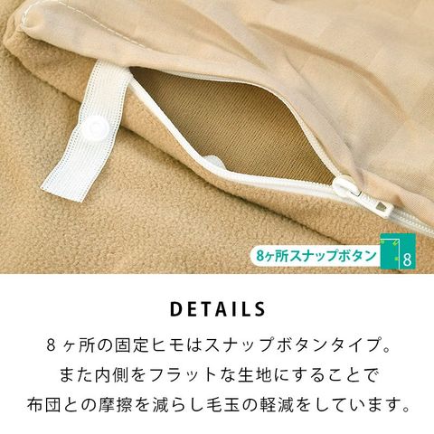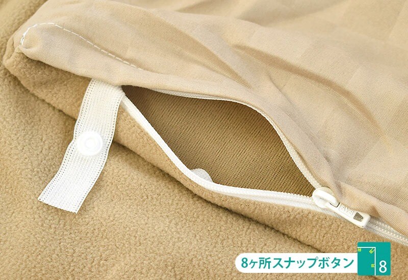 フリース素材 長所:軽くてあたたかく、速乾性もあるので冬のファブリックとして人気の素材です。発色性もよく、様々なデザインを施せます。/短所:静電気や毛玉がやや多いのが難点です。 8ヶ所スナップボタン付き 内側8ヶ所のヒモはボタンを留めるだけなので装着が簡単! 全開ファスナー サイドのファスナーが大きく全開するからお布団が出し入れしやすい! 抗菌防臭加工(フリース面) 嫌なニオイの発生を抑えて清潔さアップ | |