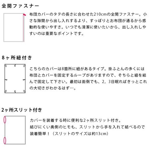 カバー内側8ヶ所にヒモ付き、さらにファスナーの反対側の辺にはカバーを装着する際に便利なスリットが両隅2ヶ所に入っています!