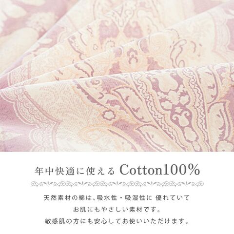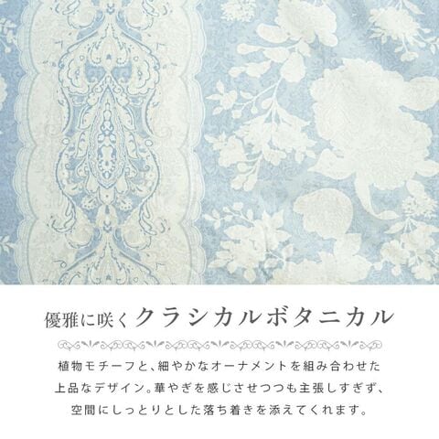 | ・優雅に咲くクラシカルボタニカル 植物モチーフと、細やかなオーナメントを組み合わせた上品なデザイン。華やぎを感じさせつつも主張しすぎず、空間にしっとりとした落ち着きを添えてくれます。 ・年中快適に使える Cotton100%天然素材の綿は、吸水性・吸湿性に優れていてお肌にもやさしい素材です。敏感肌の方にも安心してお使いいただけます。 ・両面同柄プリントで使いやすい同じデザインが両面にプリントされているため、裏表を気にせずお使いいただけます。 | |
