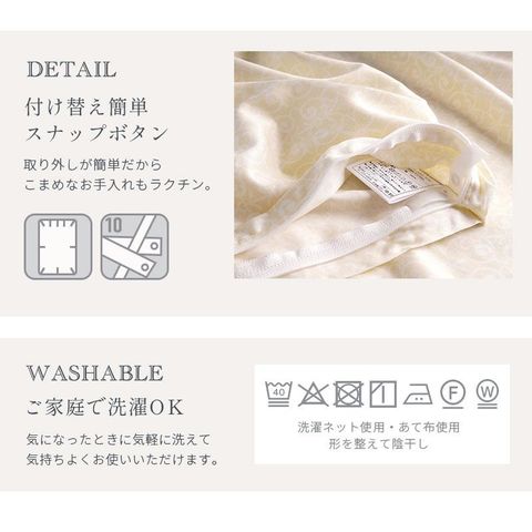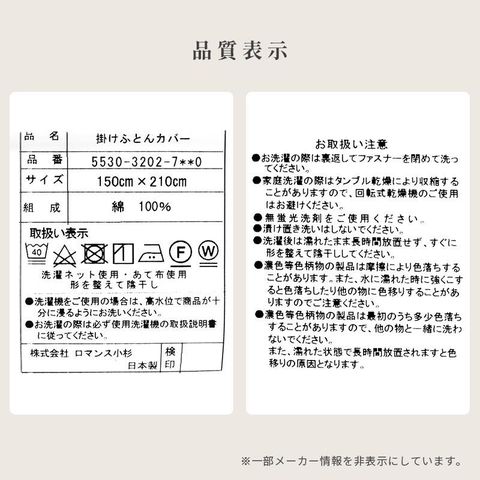 | その他注意 | ■洗濯の際は、タグなどに表記されている内容を必ず確認してから行ってください。 ■洗濯機をご使用される場合は、必ず洗濯機の取扱説明書に従ってください。 ■できるだけ実物と同じ色合いになるよう徹底してい・ワすが、ご使用の端末やブラウザなどにより実物と色合いが異なって見える場合がございます。 ■重さの表記をしておりますが、およその値です。わずかですが個体差があることをご考慮下さいませ。 ■商品のサイズ・重量は約表記です。サイズ・重量を保証するものではございませんのでご了承ください。 ■掛け布団カバーのみの品です。他のカバーや布団本体は付属しません。ご注意ください。 |