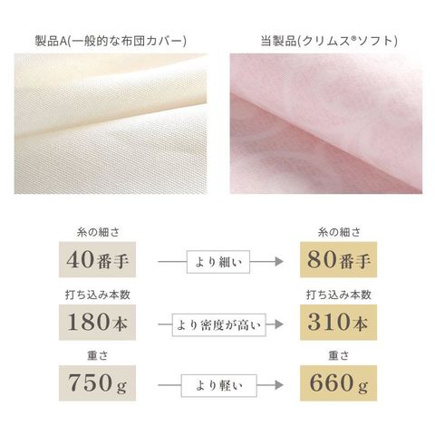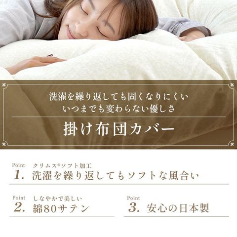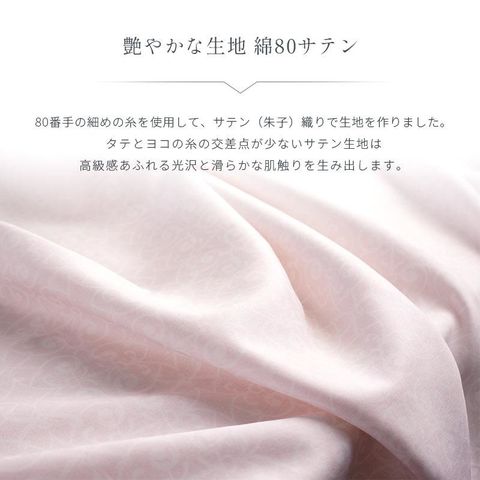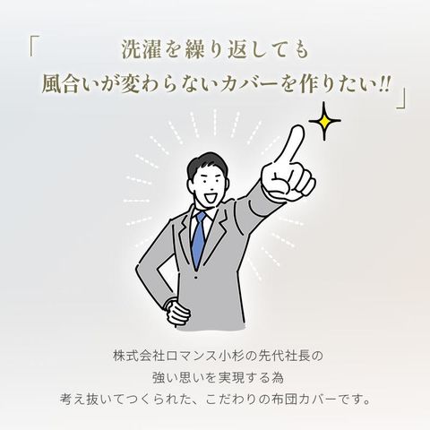 | ・高スペックの羽毛布団ほどカバーが重要 羽毛は寒くなると羽枝を伸ばして空気を取り込み、ふわふわと膨らんで暖かな空気を溜め込みます。せっかく良い羽毛布団を選んでも、布団を包むカバーが重たく通気性のないものだと、羽毛の心地よさを充分に引き出すことができません。スペックの高い羽毛布団ほど、その保温力と心地よさを充分に引き出すために、品質の高いカバー選びが大切です。 ・繰り返し洗濯してもソフトな風合いを維持 特殊な超微起毛加工により毛足の長さが均一になり、なめらかで美しいタッチで、艶やかな光沢感を実現しています。繰り返し洗濯しても、ソフトな風合いはほとんど変わりません。 ・艶やかな生地80サテン 80番手の細めの糸を使用し、サテン(朱子)織りで生地を作りました。タテとヨコの糸の交差点が少ないサテン生地は、高級感あふれる光沢と滑らかな肌触りを生み出します。 ・ロマンス小杉の高品質商品 老舗寝具メーカー「ロマンス小杉」で丁寧に造られた商品です。高い技術と品質で、どなたにでも安心してお使いいただける商品に仕上がりました。 | |