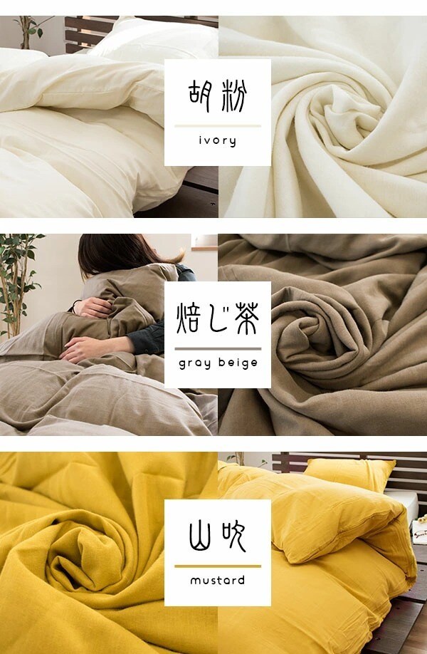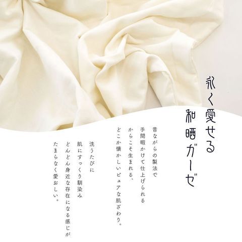 ・洗うたび馴染むやわらかガーゼ 昔ながらの製法で手間暇かけて仕上げられるからこそ生まれる、どこか懐かしいピュアなガーゼ。繊細な肌触りの和晒ガーゼは寝汗をすっと吸ってくれて、洗濯しても乾きやすい。洗うたびに肌にすっくり馴染みどんどん身近な存在になる感じがたまらなく愛おしい。 ・伝統的な和晒(わざらし)製法綿から不純物を取り除き、漂白する作業を「晒(さらし)」と呼びます。日本伝統の晒加工である「和晒」は、巨大釜と天然水を使い、手間暇かけてじっくり4日間煮込むことで、繊維の一本一本が綿本来の丸みを保ち、ふんわりやわらかい仕上がりになります。 ・羽毛布団と相性良しあたたかいお布団とは、身体にしっかりとフィットし、かつ身体に負担を掛けない軽さが重要です。せっかくの軽い羽毛布団でも、重くて固いカバーを掛けてしまうと羽毛が上から押さえつけられて羽毛布団の機能が十分に発揮できません。羽毛布団のキルトにやわらかく寄り添い、ふわりと軽く丈夫なガーゼは、まさに羽毛布団にぴったりのカバーです。 ・安心の日本製生地の裁断から仕上げに至るまで、自社国内工場で行っていて、徹底した品質管理がなされています。 |