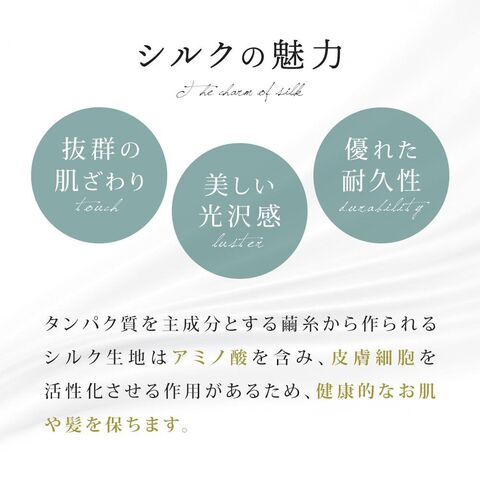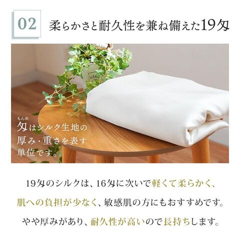 | ・シルクの魅力 タンパク質を主成分とする繭糸から作られるシルク生地はアミノ酸を含み、皮膚細胞を活性化させる作用があるため、健康的なお肌や髪を保ちます。 ・贅沢な両面シルク100%贅沢を極めた、両面シルク100%の掛け布団カバー。美しい光沢感だけでなく、吸湿性、通気性、保温性に優れたシルクが、心地よい眠りを誘います。 ・柔らかさと耐久性を兼ね備えた19匁19匁のシルクは、16匁に次いで軽くて柔らかく、肌への負担が少なく、敏感肌の方にもおすすめです。やや厚みがあり、耐久性が高いので長持ちします。 ・わずか約490gの軽量カバーシルクは綿に比べて非常に軽い素材です。布団カバーの重みが気にならないため、圧迫感がなく快適にお使いいただけます。 | |