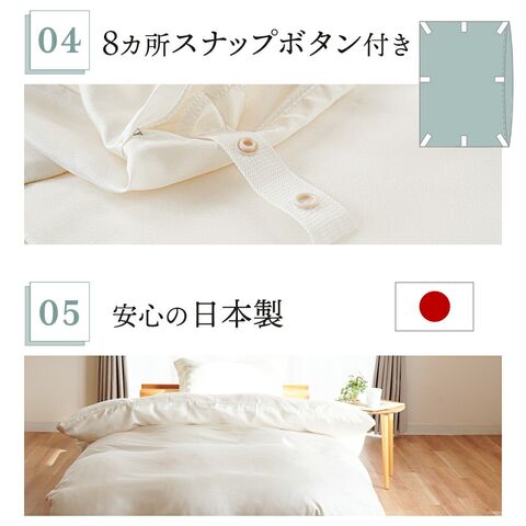 | その他注意 | ■画像はカバーの使用イメージです。掛け布団カバーのみの販売で、布団本体など他の品は付属しませんのでご注意ください。 ■洗濯の際は、タグなどに表記されている内容を必ず確認してから行ってください。 ■できるだけ実物と同じ色合いになるよう徹底していますが、ご使用の端末やブラウザなどにより実物と色合いが異なって見える場合がございます。 ■重さの表記をしておりますが、およその値です。わずかですが個体差があることをご考慮下さいませ。 ■商品のサイズ・重量は約表記です。サイズ・重量を保証するものではございませんのでご了承ください。 |