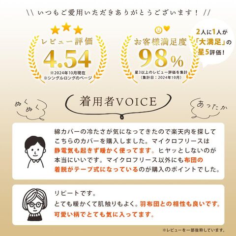 | その他注意 | ■あったかカバーについての注意書きをよくお読みください。 ■2025年9月より新柄を追加して販売しております。 ■洗濯の際は、タグなどに表記されている内容を必ず確認してから行ってください。 ■洗濯機をご使用される場合は、必ず洗濯機の取扱説明書に従ってください。 ■できるだけ実物と同じ色合いになるよう徹底していますが、ご使用の端末やブラウザなどにより実物と色合いが異なって見える場合がございます。 ■重さの表記をしておりますが、およその値です。わずかですが個体差があることをご考慮下さいませ。 ■商品のサイズ・重量は約表記です。サイズ・重量を保証するものではございませんのでご了承ください。 ■掛け布団カバーのみの販売です。他のカバーや布団本体は付属しません。ご注意ください。 |