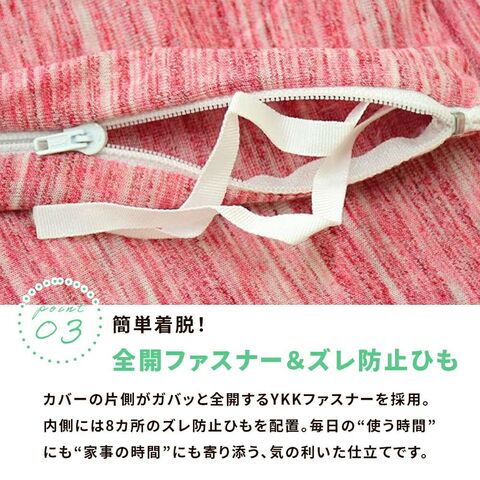 カバーの片側がガバッと全開するYKKファスナーを採用。内側には8カ所のズレ防止ひもを配置。毎日の“使う時間”にも“家事の時間”にも寄り添う、気の利いた仕立てです。