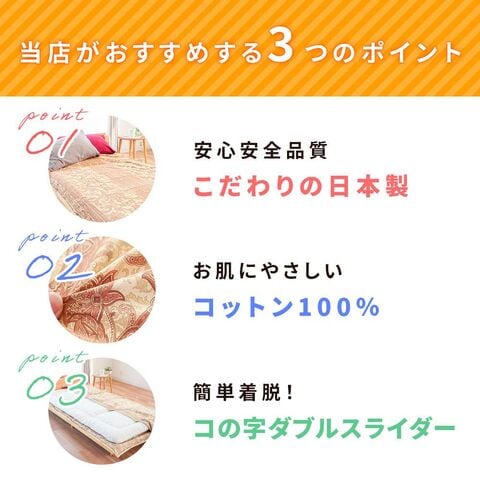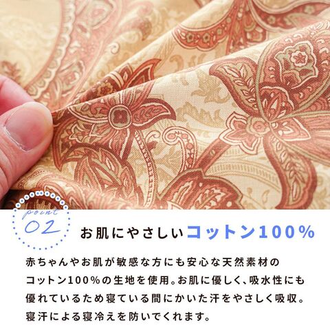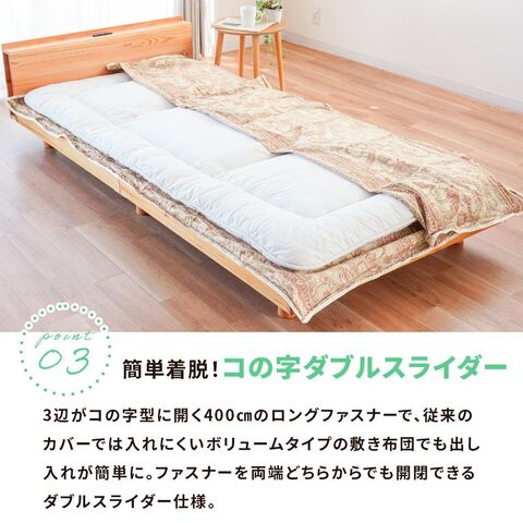 | ・安心安全品質、こだわりの日本製 もちろんデザインだけではありません。職人の技と粋を感じられる商品に仕上がりました。熟練の技で仕上げられた高品質で美しい仕上がり。安全性や、品質にこだわる方に選んでいただきたい、安心・高品質のカバーです。 ・お肌にやさしいコットン100%赤ちゃんやお肌が敏感な方にも安心な天然素材のコットン100%の生地を使用。お肌に優しく、吸水性にも優れているため寝ている間にかいた汗をやさしく吸収。寝汗による寝冷えを防いでくれます。 ・簡単着脱!コの字ダブルファスナー3辺がコの字型に開く400cmのロングファスナーで、従来のカバーでは入れにくいボリュームタイプの敷き布団でも出し入れが簡単に。ファスナーを両端どちらからでも開閉できるダブルファスナー仕様。 | |