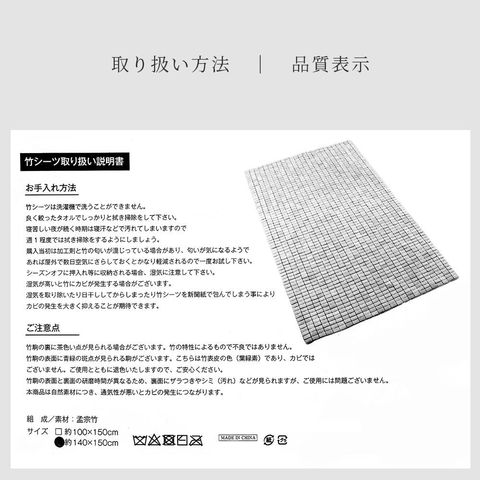 | ・日本の蒸し暑い夏に快適な竹シーツ 日本人にとっても馴染み深い「竹」を使った冷感寝具。自然なひんやり感が心地よく、暑い夏の夜におすすめです。 ・竹の冷感効果でひんやり。 竹は熱伝導率が高く、表面の温度を素早く発散する効果があります。竹の皮下部分は特に熱伝導率が高く、ひんやり感が長続きします。 ・不快な熱・汗を発散! 竹ドミノシーツは、細かな竹駒を丁寧につなぎ合わせてできています。竹駒と竹駒の間に隙間ができるため、睡眠時の不快な熱や汗もしっかりと発散します。 ・柔軟になじむシーツ 細やかな竹の駒が、使用するマットレスや敷き布団のやわらかさに合わせてきちんと沿います。竹の硬さとひんやり感を感じつつ、爽やかに眠ることができます。 ・安全面にも考慮したサイズ もしものときの髪の毛の挟み込みを考慮し作られた、通常のシングルサイズ(200cm)よりも丈が短めの150cm。それでも挟み込み等が気になる場合は薄手のシーツなどをお使い下さい。 ・コンパクトに収納 小さく折りたたんだり、丸めることができるので、収納も場所を取らず、カンタン便利。 | |