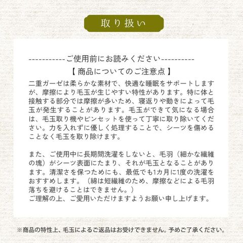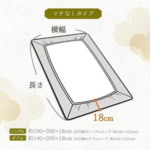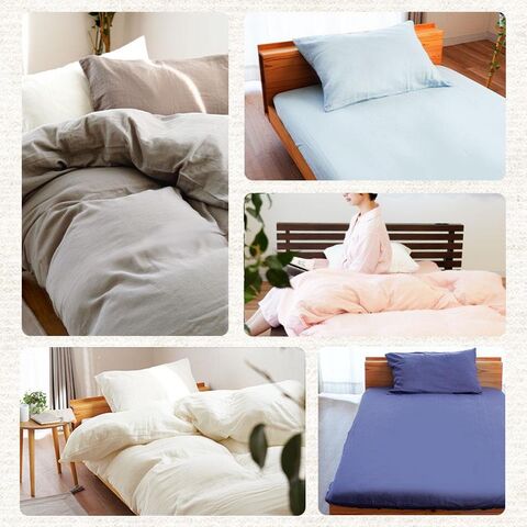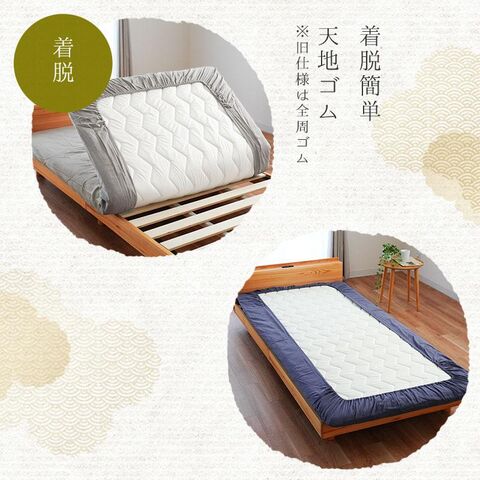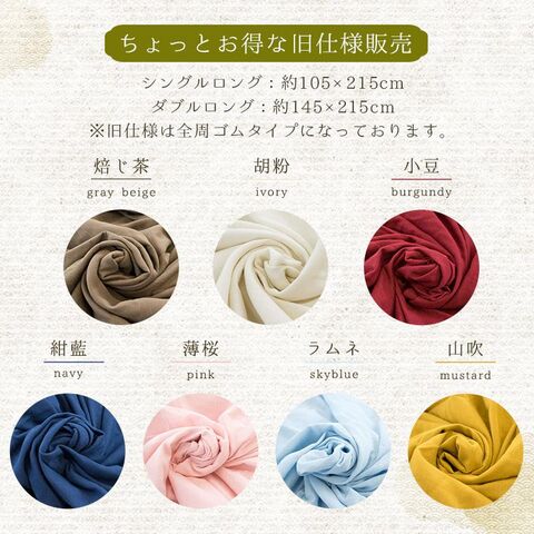 ・洗うたび馴染むやわらかガーゼ 昔ながらの製法で手間暇かけて仕上げられるからこそ生まれる、どこか懐かしいピュアなガーゼ。繊細な肌触りの和晒ガーゼは寝汗をすっと吸ってくれて、洗濯しても乾きやすい。洗うたびに肌にすっくり馴染みどんどん身近な存在になる感じがたまらなく愛おしい。 ・伝統的な和晒(わざらし)製法綿から不純物を取り除き、漂白する作業を「晒(さらし)」と呼びます。日本伝統の晒加工である「和晒」は、巨大釜と天然水を使い、手間暇かけてじっくり4日間煮込むことで、繊維の一本一本が綿本来の丸みを保ち、ふんわりやわらかい仕上がりになります。 ・フィットで取り付け簡単カバーの上下に付けたゴムが敷き布団にフィットするので、付け外しが簡単フィットに。一人では大変なカバーの着脱も簡単に、更に綺麗に仕上げることができます。 ・安心の日本製生地の裁断から仕上げに至るまで、自社国内工場で行っていて、徹底した品質管理がなされています。 ・マチ付きの敷き布団にも対応厚み10cmくらいまでなら、マチ付きの敷き布団にも対応します。当店の健康敷きふとん系にもお勧めです。 |