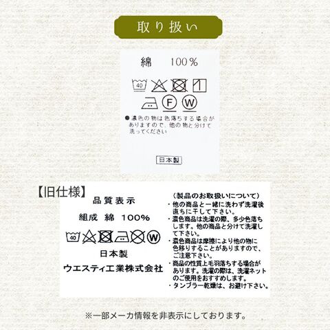| お取扱い | ・![]() ・洗濯ネットの使用をおすすめします。 ・他のものと一緒に洗わず洗濯後はただちに干してください。 |