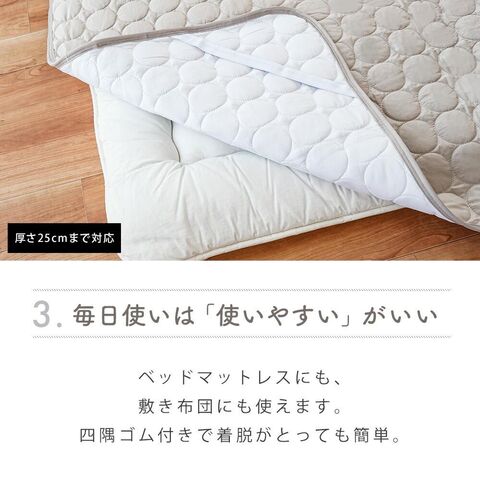 | ・表面は肌に優しい綿100% 天然素材コットン100%の生地を使用。 肌に優しく、吸水性にも優れているため寝ている間にかいた汗をやさしく吸収。 寝汗による寝冷えを防いでくれます。 ・肌触りしっかり平織りタイプ密に織られているため、丈夫さ・耐久性にも優れ、型崩れしにくいのが特長。 平織り特有のフラットな表面でベタつきにくく、汗ばんでも肌離れがよいので、いつでもさらり。 ・毎日使いは「使いやすい」がいいベッドマットレスにも、敷き布団にも使えます。 四隅ゴム付きで着脱がとっても簡単。 ・お洗濯しても乾きやすい裏面は毛玉のできにくい、つるりとしたポリエステル生地。 また、中わたにもふんわり使い心地やわらかなポリエステルわた入りで、お洗濯後も乾きやすくなっています。 薄手で使いやすく、収納もコンパクト! ・家族で広々ファミリーサイズ“ふとんの谷間” が気にならず、川の字でも快適。 家族分のパッドを個別にそろえるよりおトク!シーツ替えの手間も一回分で済むから毎日の家事がラクに。 | |