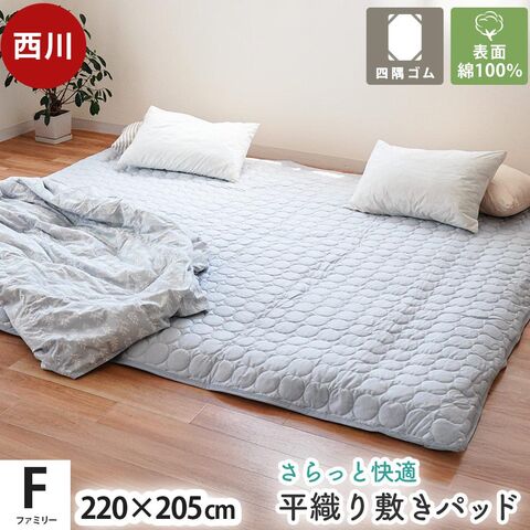 西川 平織り 敷きパッド 綿100% 220×205cm ファミリーサイズ 綿ブロード 夏用 キルティング 吸水 (ブルー)【9F-BM95080776BL】