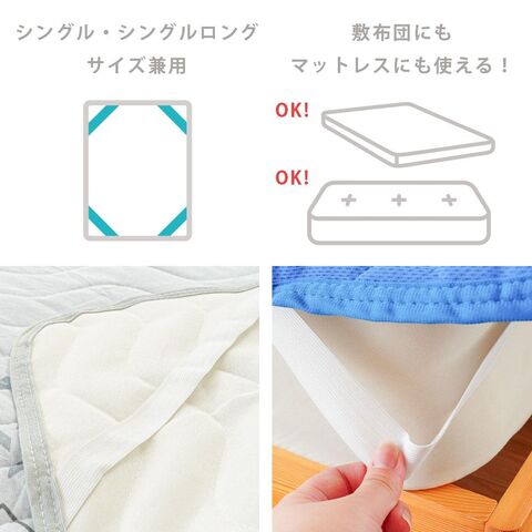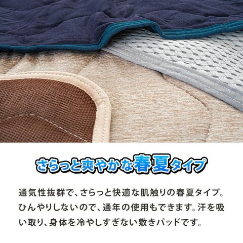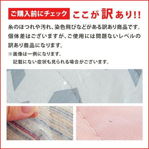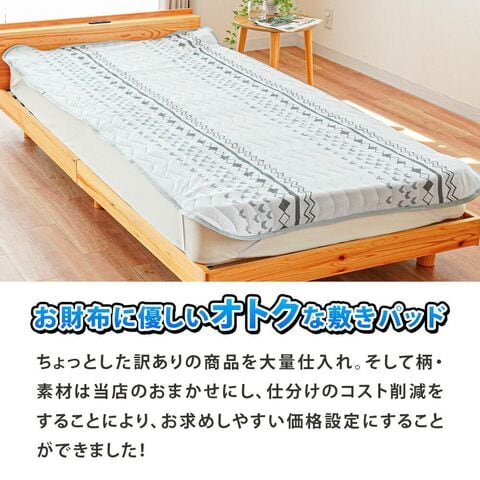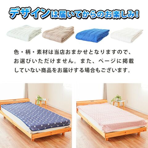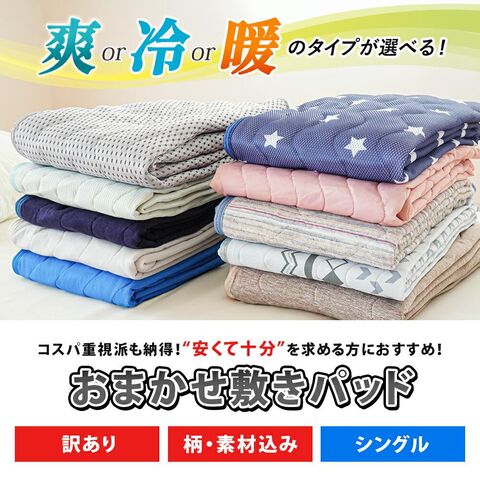 | ・お財布に優しいオトクな敷きパッド ちょっとした訳ありの商品を大量仕入れ。そして柄・素材は当店のおまかせにし、仕分けのコスト削減をすることにより、お求めしやすい価格設定にすることができました! ・さらっと爽やかな春夏タイプ通気性抜群で、さらっと快適な肌触りの春夏タイプ。ひんやりしないので、通年の使用もできます。汗を吸い取り、身体を冷やしすぎない敷きパッドです。 ワッフル生地、ガーゼ生地、タオル生地など、表面の素材やキルティング、裏面の色味は商品により異なります。仕様はお選びいただけませんので、あらかじめご了承ください。 ・ひんやり快適な接触冷感タイプ触れるとひんやりする接触冷感タイプ。冷房と併用することでさらにひんやりを実感。暑い夏におすすめの敷きパッドです。 こちらも春夏タイプと同様に、表面の加工やキルティング加工、裏面の色等は商品により異なります。いずれもおまかせとなりますので、あらかじめご理解のうえご注文ください。 ・ふんわり暖か秋冬タイプあたたかい保温性に優れたフランネル生地。 しっとりとろけるような肌触りで、程よく起毛してふわり。冷えた空気の中でも優しい使い心地です。 ・四隅ゴムバンド付きベッドマットレスや敷き布団に固定するためのゴムバンドが四隅に付いています。寝返りをしてもズレにくく、快適に使用できます。着脱も簡単! ・デザインは届いてからのお楽しみ!色・柄・素材は当店おまかせとなりますので、お選びいただけません。また、ページに掲載していない商品をお届けする場合もございます。 ・訳ありアウトレット商品糸のほつれや汚れ、染色飛びなどがある訳あり商品です。個体差はございますが、ご使用には問題ないレベルの訳あり商品になります。※一例になります。記載にない症状も見られる場合がございます。 | |