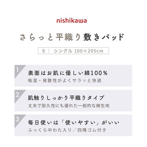 西川 平織り 敷きパッド 綿100% シングル 100×205cm 綿ブロード 夏用 キルティング 吸水 (ブルー)【9S-BM05020770BL】