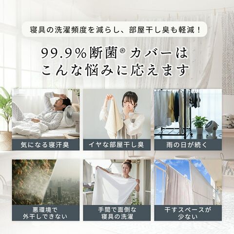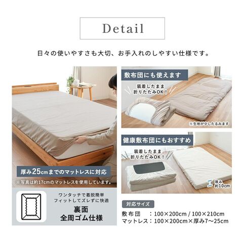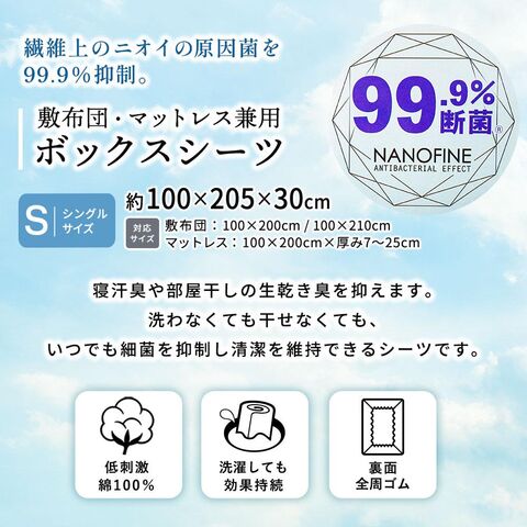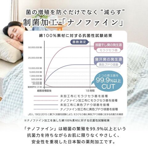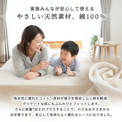 | ・ニオイ菌を99.9%断菌(R)!清潔をキープ 綿素材100%にナノファイン加工を施し、ニオイ菌の原因となる細菌を99.9%断菌(R)します。部屋干し臭や寝汗臭を抑制し、洗えない日や干せない日でも安心して使えます。繊維上の細菌繁殖を抑え、いつでも清潔な状態を維持できます。 ・悪臭菌をしっかりカット、抗菌とは違う“制菌(断菌(R))”の実力「ナノファイン」は細菌の繁殖を99.9%以上抑える日本製の安全な薬剤加工です。部屋干し臭の原因であるモラクセラ菌、寝汗臭の原因である黄色ブドウ球菌を99.9%以上カット。抗菌加工が菌の増殖を抑えるのに対し、制菌(断菌(R))加工は菌そのものの数を減少させるため、根本的なニオイ対策が可能です。 ・繰り返しの洗濯にも強く、効果が持続ナノレベルの薬剤が繊維に密着。洗濯しても加工が取れにくく、断菌(R)効果が24時間続きます。 ・綿100%素材でお肌にやさしく、家族みんなが安心して使える低刺激なコットンを100%使用。吸水性に優れ、寝ている間の汗をやさしく吸収してムレ感を軽減します。ふんわりとした肌触りでデリケートなお肌にもやさしく、小さなお子さまからお年寄りまで、家族みんなが安心して気持ちよく使えるシーツです。 ・マットレスから敷布団・健康敷布団まで幅広く対応厚み25cmまでのマットレスに対応し、敷布団や厚み約10cmほどの健康敷布団にも使用可能。カバーを装着したまま折りたたみができるため、毎日の上げ下ろしや収納もラクに行えます。敷き寝具の種類を選ばず、使いやすい仕様です。※生地が少したるむ場合があります。 | |