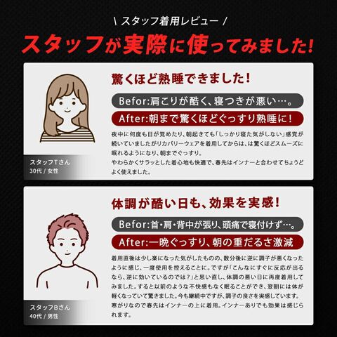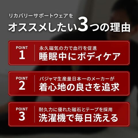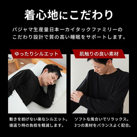 | ・肩・腰部分に磁石を配置 個人差のあるツボを抑えるのではなく、効果が出やすい場所に永久磁石を配置しております。 ・着心地にこだわりパジャマ生産量日本一カイタックファミリーのこだわり設計で質の高い睡眠をサポートします。 【ゆったりシルエット】動きを妨げない楽なシルエット。寝返り時の負担を軽減します。 【肌触りの良い素材】ソフトな風合いでリラックス。3つの素材をバランスよく配合。 ・洗濯機で毎日洗える耐久性に優れた磁石とテープを採用しているため、ご家庭の洗濯機で毎日お洗濯することができます。 | |
