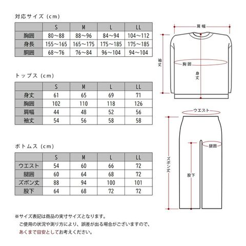 | サイズ | Mサイズ 胸囲:88~96cm 身長:165~175cm 胴囲:76~84cm (身丈65cm、胸囲110cm、肩幅48cm、袖丈56cm、ウエスト60cm、腿囲64cm、ズボン丈94cm、股下68cm) 実寸サイズ表 ※誤差の出る場合があります。あくまで目安としてお考えください。 |