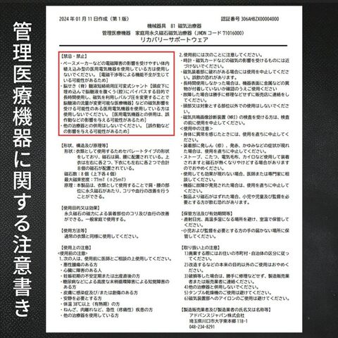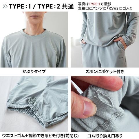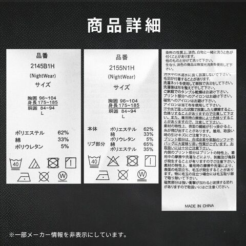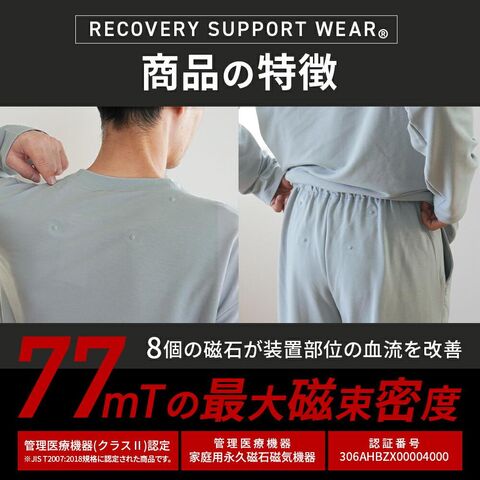 | 仕様 | 長袖・長パンツ トップス ・4カ所に永久磁気付き ・かぶりタイプ ボトム ・4カ所に永久磁気付き ・調節できるヒモ付き ・ウエストゴム(ゴム取替口有) ・両サイドにポケット付き ・前表示タグあり ・前開き無し |