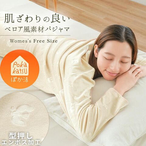 暖か ベロア風 パジャマ レディース なめらか 型押し 小鳥柄 かわいい 長袖 長ズボン 上下セット 丸首 かぶり ふんわり 軽い ゆったり ぽか活 カジュアル シンプル 婦人 セットアップ 節電 joliespase (クリーム)【A-96-6086CR】