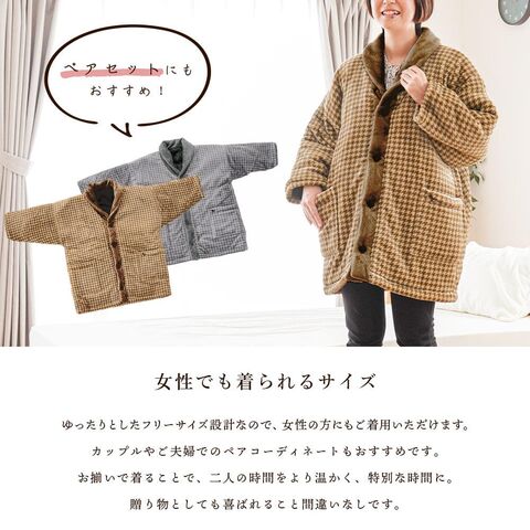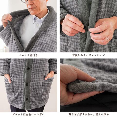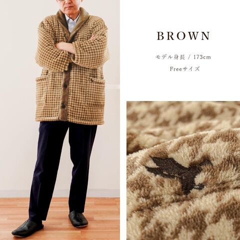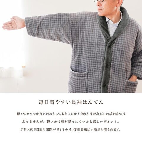 | ・あったかなめらか素材 表面はふんわりとした柔らかな手触りのマイクロファイバー素材を使用したふわもこプレミアムシリーズ。冬にぴったりなあったか素材です。中わた入りなのでじんわり身体をあたためます。 ・高級感溢れる大人カジュアルな千鳥柄千鳥柄の独特な模様と洗練された雰囲気で、羽織るだけでお洒落で上品な印象を演出します。大人カジュアルなデザインでチャコールグレーとブラウンの2色をご用意しました。 ・毎日着やすい長袖はんてん軽くてゴワつかないのにとってもあったか!中わたは昔ながらの綿わたではありませんが、軽いので肩が凝りにくいのも嬉しいポイント。ボタン式で自由に開閉ができるので、体型を選ばず簡単に着られます。 ・女性でも着られるサイズゆったりとしたフリーサイズ設計なので、女性の方にも着用いただけます。カップルやご夫婦でのペアコーディネートもおすすめです。お揃いを着ることで、二人の時間をより温かく、特別な時間に。贈り物としても喜ばれること間違いなしです。 ・GEORGE KENTジョージケントは、英国紳士の代表ともいえる英国王ジョージと英国南東部にあった古の王国の「KENT」から古き良き時代をイメージさせるブランドとして誕生しました。 英国がファッションの発祥の時代だった頃から、英国紳士達は、最新のモードと生活スタイルを楽しんでいました。 | |