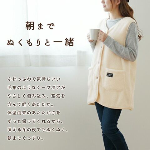 | ・ふわふわうっとりひつじさんタッチ ふわっふわで気持ちいい。毛布のようなシープボアのやさしい生地に包まれます。細かい繊維の中に空気をたくさん含んでいるので、もこもこのボリューム感でも軽くてやわらかく動きやすい。 体温由来のあたたかさをずっと保ってくれるから、凍える冬の夜でもぬくぬく、朝までぐっすり。 ・おうち時間にぴったりなあったかベスト軽やかな着心地の袖なしタイプで動きやすく、家事やリラックスタイムにも最適。 ふわふわボアと木製ボタンがナチュラルなかわいさをプラスします。 | |