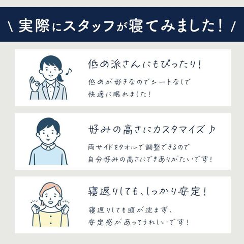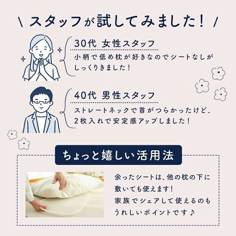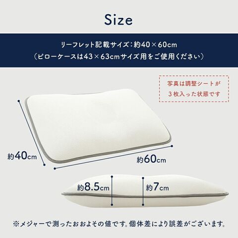 | サイズ | 約40×60cm 枕本体厚み: ・中央のくぼみ部分:約3cm ・外周の高くなっている部分:約5cm 調整シート厚み:約1.5cm/枚 |