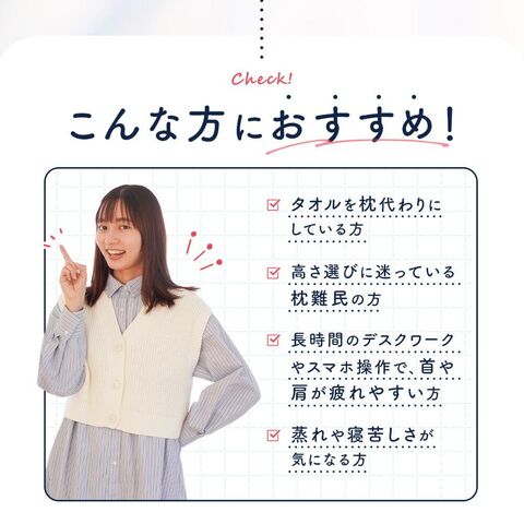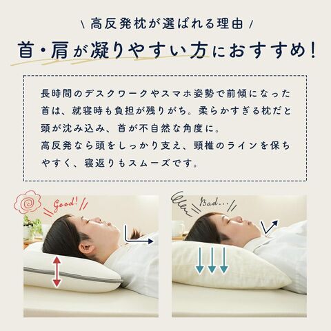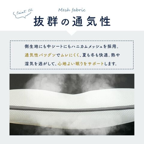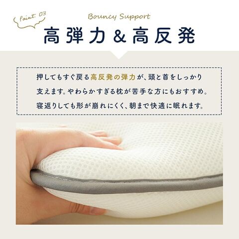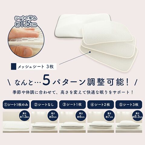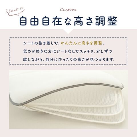 | ・自由自在な高さ調整 シートの抜き差しで、かんたんに高さを調整。低めが好きな方はシートなしでスッキリ、少しずつ試しながら、自分にぴったりの高さが見つかります。 ・抜群の通気性側生地にも中シートにもハニカムメッシュを採用。通気性バツグンでムレにくく、夏も冬も快適。熱や湿気を逃がして、心地よい眠りをサポートします。 ・高弾力&高反発押してもすぐ戻る高反発の弾力が、頭と首をしっかり支えます。やわらかすぎる枕が苦手な方にもおすすめ。寝返りしても形が崩れにくく、朝まで快適に眠れます。 ・頭を安定させるくぼみ形状枕の中央にくぼみを設け、頭が自然にフィットする形状に。首や肩にやさしく沿って、負担をやわらげます。 ・丸洗いできていつでも清潔洗濯ネットに入れて、そのまま丸洗いOK。シャワーでさっと流すだけでも清潔をキープ。乾きやすく、いつでも気持ちよく使えます。 | |