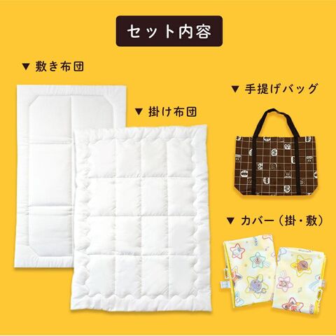 ・洗濯機で洗えて清潔 カバー類はもちろん、掛け布団、敷き布団までもご家庭の洗濯機で洗えます。 掛け布団はホコリの出にくい合繊わた入り。敷き布団はしっかり固わたタイプ! 敷き布団の綿ずれ防止キルトを採用することで、洗濯機で洗っても中綿がズレないので快適。 ・ご家庭の乾燥機がが使える優れモノ!ふとん本体とカバー類が、タンブラー乾燥に対応!急なお洗濯も天候に左右されないので時短&安心です。 ・ファスナータイプ掛け布団カバーと敷き布団カバーは、取り付け・取り外しがしやすいファスナー式。 スライドしやすいファスナーで大きく開くので、お子さまの軽い力でも簡単にお布団の準備ができます。 園によってヒモ指定やファスナー指定が異なりますので、ご購入前に必ずご確認ください。 ・手さげバッグ付きお洗濯など、保育園からの定期的な持ち帰りに便利な専用手さげバッグ付き。 不織布なのでとっても軽い!しかし、ちょっと頼りないので雨の日などは別売りのお昼寝ふとん用バッグをおすすめします。 「くみ」、「なまえ」が書けるネームタグが付いています。 セットの5点すべてにタグが付いているので、カバーから中身を出したときも迷子になりにくく、大きく書けるので分かりやすい。 ・お昼寝ふとんってなに?お昼寝布団は、ベビー布団やベビー布団セットとは違って、保育園、幼稚園、での2∼3時間ぐらいのお昼寝専用に作られたものです。 保育園・幼稚園から持ち帰ることも考慮されているので 持ち運びやすさや、かさ張りにくさに重点が置かれています。 また、園児全員の布団を保育園・幼稚園の押し入れに片付ける必要や園児自身が自分で持ち運びする場合もあるので、 ベビー布団、ベビー布団セットよりも薄手で軽い作りになっています。 |