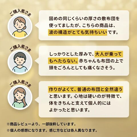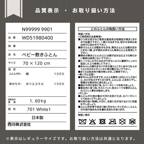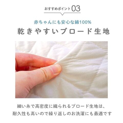 | その他注意 | ■2025年9月5日より厚み5.5cm→4cmにサイズ変更になりました。機能的に大差はございませんのでご安心ください。 ■防水キルトパットシーツは完全防水ではありません。濡れた場合にはできる限りお早めに取り替えてください。 ■洗濯の際は、タグなどに表記されている内容を必ず確認してから行ってください。 ■洗濯機をご使用される場合は、必ず洗濯機の取扱説明書に従ってください。 ■できるだけ実物と同じ色合いになるよう徹底していますが、ご使用の端末やブラウザなどにより実物と色合いが異なって見える場合がございます。 ■重さの表記をしておりますが、およその値です。わずかですが個体差があることをご考慮下さいませ。 ■商品のサイズ・重量は約表記です。サイズ・重量を保証するものではございませんのでご了承ください。 |