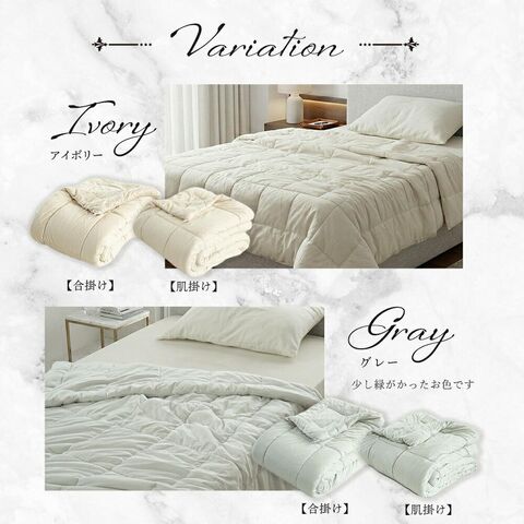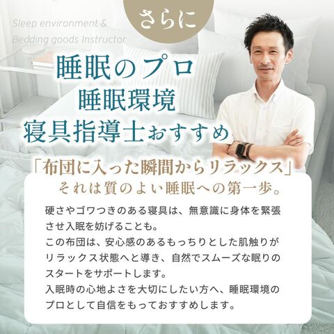 ・光沢のあるなめらか素材「マイクロ天竺生地」 側生地に、しなやかに伸びて肌に寄り添う柔らかなマイクロ天竺素材を採用。光の加減でほんのりと浮かび上がる上品な光沢が美しく、いつもの寝室をアップグレードします。 ・美しいシルエット・均一なボリューム感「シート状中わた」独自の「シート状中わた」と細密なキルト構造で、寝返りによる片寄りを防止。わた切れしにくく、きれいに長持ちし、朝まで身体に寄り添う心地よいフィット感です。 ・やみつき触感!ふんわり、もっちりマイクロわた一般的なポリエステル綿より細かい繊維のマイクロ綿がたっぷり空気を含み、やさしく保温します。肌掛けふとんは400g入り、合掛けふとんは700g入りです。 ・カジュアルすぎない端正な美しさ「フラットな多マスキルト」身体に沿いやすいキルティングと、こだわりのフラットな表面が寝室全体をすっきり端正に引き締めホテルライクな雰囲気に。合掛けふとんは7×8マス、肌掛けふとんは8×10マス仕様。頻回洗濯しても型崩れしにくいのも嬉しいポイントです。 ・お手入れ簡単で乾きやすい 丸洗いOKでいつも清潔花粉などのアレルギー対策やダニ・ハウスダスト対策、暑い時期の寝汗が気になる方にもおすすめ。直接肌に触れるものだから、きれいが安心。ご家庭の洗濯機で丸洗いが可能で、乾きやすいポリエステル素材を使用しています。 ・創業450年以上の信頼 西川品質品質にもこだわりたいという方にも安心。日本有数の寝具メーカー西川の品質基準を満たした肌布団です。中国製ではありますが、長年寝具づくりを続けてきた西川ならではの企画・設計基準のもと、生地選定から縫製、仕上げまで管理。細部まで整えられた仕立てが、毎日の快適さにつながります。 ・2枚合わせで1年中快適 オールシーズン対応肌掛け布団と合掛け布団の2枚合わせで、季節の移り変わりやお部屋の環境に合わせて3通りの使い方が可能。2枚合わせセット購入特典として固定ボタンテープ付き。さらにセットにはホックテープも付属します。ホックテープの詳細についてはこちらをご確認ください。 「布団に入った瞬間からリラックス」それは質のよい睡眠への第一歩。硬さやゴワつきのある寝具は無意識に身体を緊張させ入眠を妨げることも。この布団は、安心感のあるもっちりとした肌触りがリラックス状態へと導き、自然でスムーズな眠りのスタートをサポートします。入眠時の心地よさを大切にしたい方へおすすめです。 |