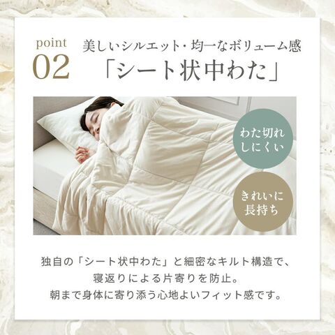 中わたをシート状に重ねる構造を採用し、洗濯後も形が崩れにくい仕様に。