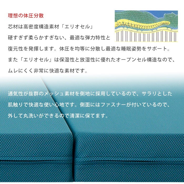 | ■メッシュウィングは「しっかり硬め」の商品ですので、今まで柔らかい寝具をお使いの方には最初硬く感じられる場合があります。又、不自然な寝姿勢で寝ていた方は、メッシュウィングで急に正しい寝姿勢になる事で痛みを感じる場合があります。その場合、ベッドパット等を敷き徐々に慣らしていくのがおすすめです。 ■芯材は時間の経過とともに変色をしますが、品質や性能には全く問題はございません。直射日光は芯材の劣化につながる可能性がありますので、天日干し等はお避け下さい。 ■マットレスが柔らかくなった場合、湿気による軟化が考えられます。カビ等の原因にもなりますので、ご使用にならない時には立てかけたりして定期的に裏側の湿気を飛ばしてください。マットレスに布団乾燥機・またドライヤー、扇風機等を使用して乾燥を促進する事で、快適なコンディションでお使いいただく事が可能になります。 ■メッシュウィングは、3つのエリオセルに分かれてメッシュのカバーに入っています。チャックで出し入れも出来ますので、定期的に、上中下を入れ替えてお使い頂くと、湿気対策も出来ますし、ベストコンディションで永くお使い頂く事が出来ます。 ■長く快適にお使いいただくために除湿シートとの併用をおすすめしています。 |