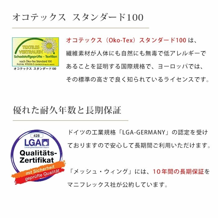 | ■ドイツの工業規格LGA-GERMANYの認定を受け、マットレスのへたりによる「芯材の潰れ」や「目に見える変形」に対して、保証を実現しています。 ■寝心地を保証するものではありません。 ■変形していても「カビ」が発生している場合は対象外です。湿気による変形の場合は乾燥をかけることで元に戻ることが殆どです。 ■つぶれや変形は厳密には芯材に対して5%程度というのが基準です(ですが、エリオセルはそもそも通常の使用であれば「変形する」というのは理論上あまり考えられませんのでご安心してご利用ください)。 |