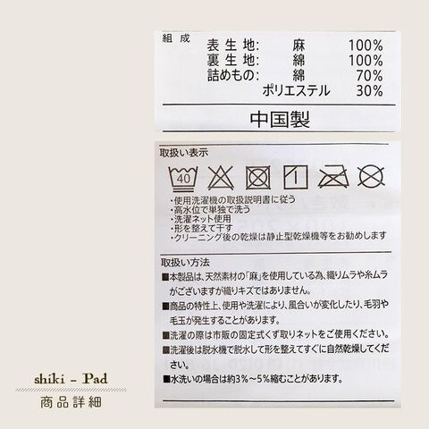| 組成 | 表生地:麻100%(リネン) 裏生地:綿100% 詰め物:綿70%、ポリエステル30% |