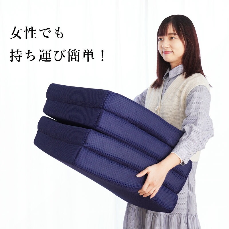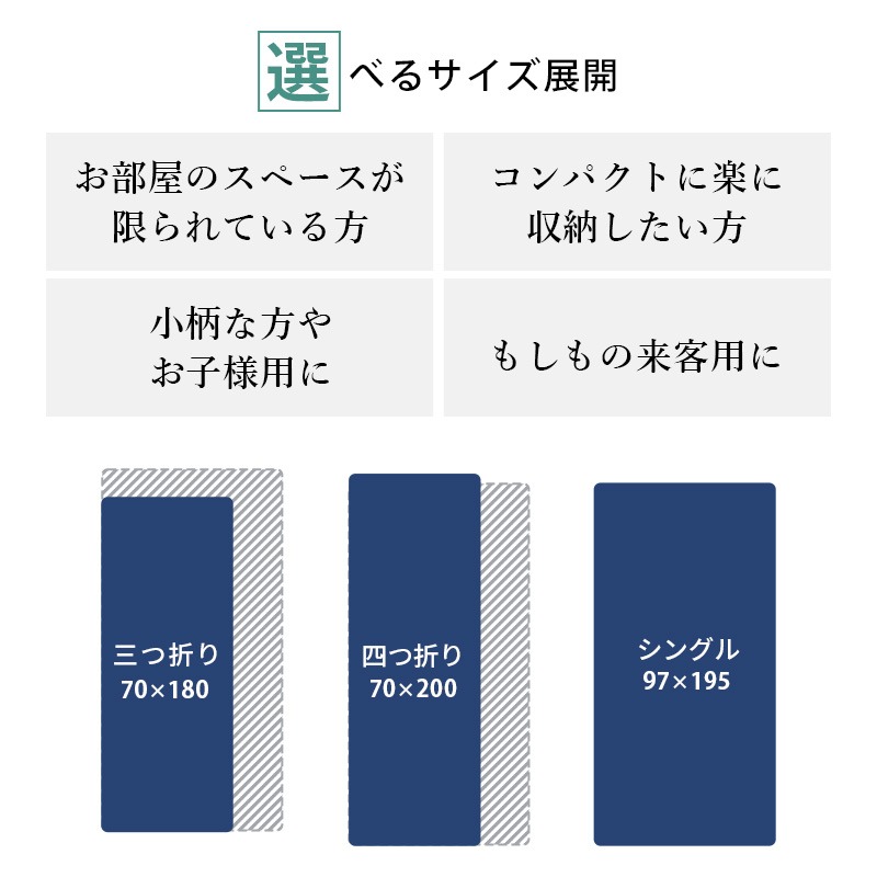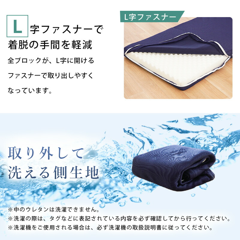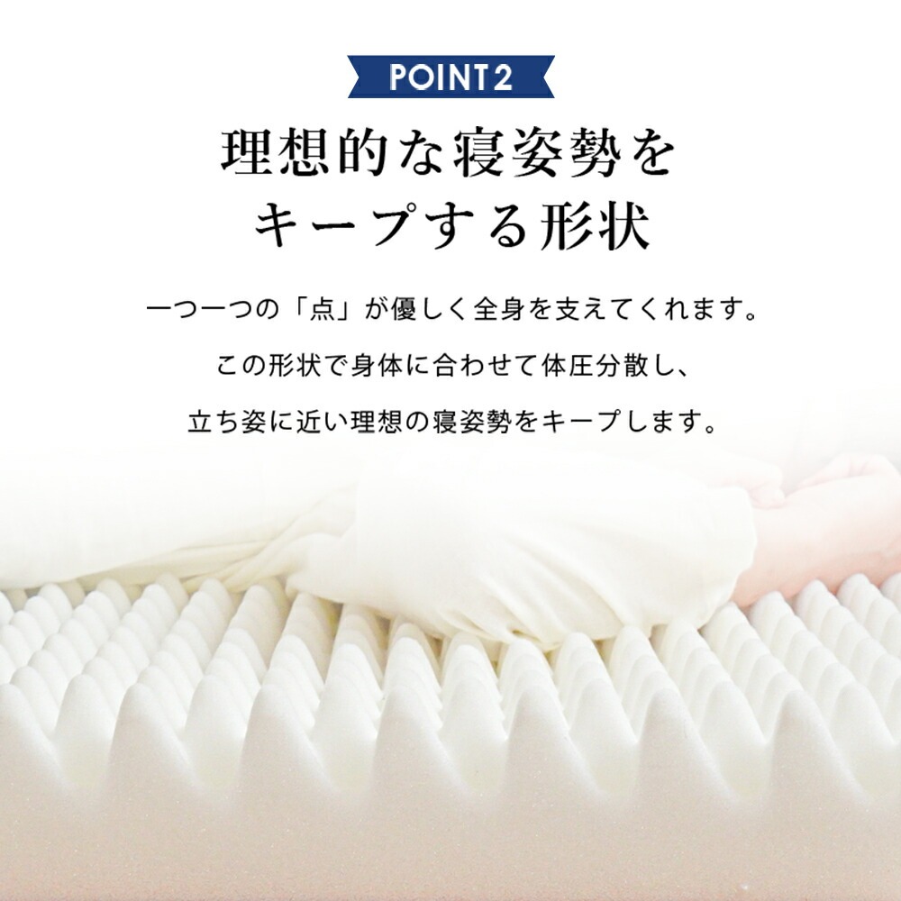 ・国内自社工場から"安心の眠り"をお届け。 【日本国産ウレタン使用】品評に定評のある、高品質な国産ウレタンフォームを使用しています。 お部屋のスペースが限られている方、コンパクトに楽に収納したい方、小柄な方やお子様用に、もしもの来客用におすすめなごろ寝サイズ。 ・丁度いい硬さの150N高反発ウレタン高い反発力と程よいクッション性で身体が沈み込みすぎず、快適にお使いいただけます。 ・理想的な寝姿勢をキープする形状一つ一つの「点」が優しく全身を支えてくれます。この形状で身体に合わせて体圧分散し、立ち姿に近い理想の寝姿勢をキープします。 ・底付き感のないしっかりとした寝心地床に直接敷いても底付き感がなく、しっかりとしたクッション性のある寝心地です。 側生地はサラッとした肌触りで通気性が抜群のメッシュ素材を使用しています。側面にはファスナーが付いているため、外して丸洗いが可能です。 マットレスを圧縮することで、スムーズな搬入やコスト削減に。 |