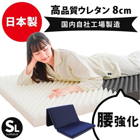 | ・自慢の国内自社工場製。 【日本国産ウレタン使用】品評に定評のある、高品質な国産ウレタンフォームを使用しています。 【安心のクオリティ日本製】国内の自社工場で作られているため安心して、お使いいただけます。 ・腰部を硬くしたバランス構造特に体重のかかる中央部分(腰部)を硬めにしたバランス構造。背中、腰部分の沈み込みが少なく、腰への負担を軽減します。腰痛でお悩みの方にもおすすめです。 ・硬めの高反発ウレタンが寝返りをサポート高い反発力・程よいクッション性で寝返りをサポート。寝返りをすることで血行を促し、身体の負担を軽減するとともに、身体と敷き布団の間にある湿気を発散してくれます。 ・理想的な寝姿勢をキープする形状一つ一つの「点」が優しく全身を支えてくれます。この形状で身体に合わせて体圧分散し、立ち姿に近い理想の寝姿勢をキープします。 ・底付き感のないしっかりとした寝心地床に直接敷いても底付き感がなく、しっかりとしたクッション性のある寝心地です。 【ローテーション可能】中材のウレタンは取り外せるので、入れ替えることができます。 【血流を妨げない凹み】点は面よりも身体を圧迫する面積が少なく、血流に負荷を与えません。 ・側生地は通気性の良いメッシュ素材側生地はサラッとした肌触りで通気性が抜群のメッシュ素材を使用しています。側面にはファスナーが付いているため、外して丸洗いが可能です。 【L字ファスナーで着脱の手間を軽減】3ブロックとも、L字に開けるファスナーで取り出しやすくなっています。 ・収納・お手入れ簡単三つ折りタイプ折りたたみ簡単な三つ折りタイプ。使わないときは立てかけて湿気対策ができます。コンパクトに収納できるので来客用にもおすすめです。 ・搬入しやすいロール梱包でお届けマットレスを圧縮することで、スムーズな搬入やコスト削減に。 | |