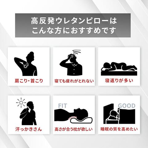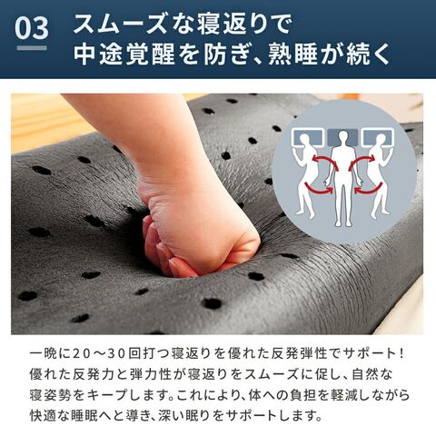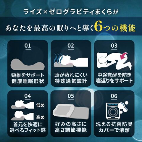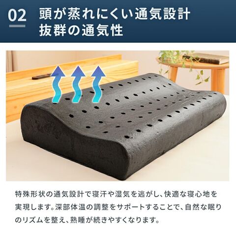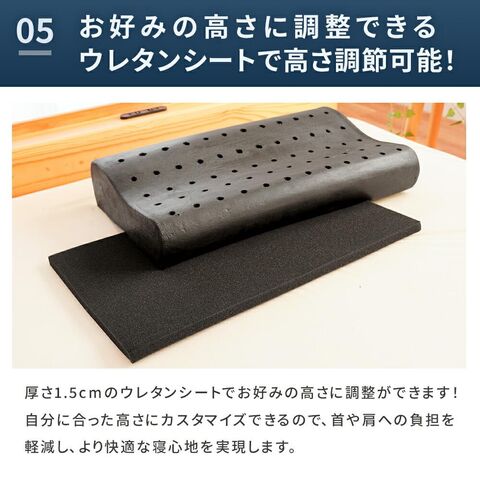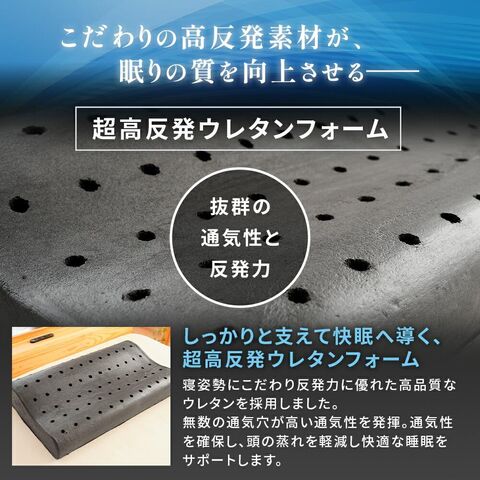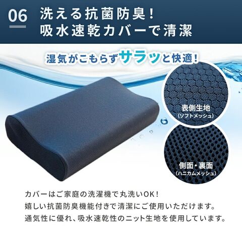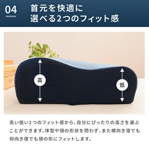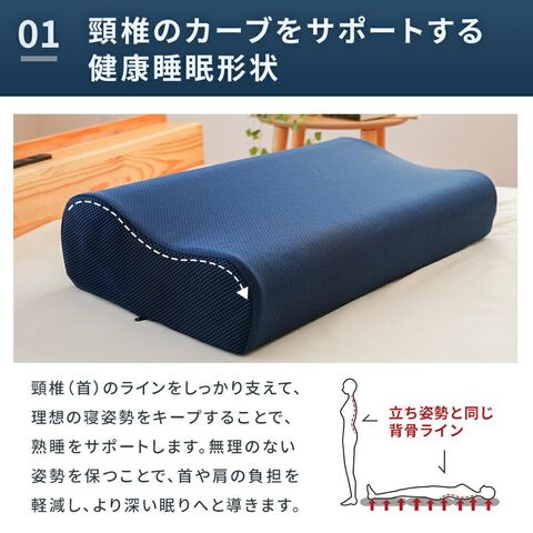| ・頸椎のカーブをサポートする健康睡眠形状 頸椎(首)のラインをしっかり支えて、理想の寝姿勢をキープすることで、熟睡をサポートします。無理のない姿勢を保つことで、首や肩の負担を軽減し、より深い眠りへと導きます。 ・頭が蒸れにくい通気設計、抜群の通気性特殊形状の通気設計で寝汗や湿気を逃がし、快適な寝心地を実現します。深部体温の調整をサポートすることで、自然な眠りのリズムを整え、熟睡が続きやすくなります。 ・スムーズな寝返りで中途覚醒を防ぎ、熟睡が続く一晩に20~30回打つ寝返りを優れた反発弾性でサポート!優れた反発力と弾力性が寝返りをスムーズにし、無理のない自然な姿勢を保ちます。これにより、体への負担を軽減しながら快適な睡眠へと導き、深い眠りをサポートします。 ・首元を快適に、選べる2つのフィット感高い低い2つのフィット感から、自分にぴったりの高さを選ぶことができます。体型や頭の形状を問わず、また横向き寝でも仰向き寝でも頭の形にフィットします。 ・お好みの高さに調整できる、ウレタンシートで高さ調節可能!厚さ1.5cmのウレタンシートでお好みの高さに調整ができます!自分に合った高さにカスタマイズできるので、首や肩への負担を軽減し、より快適な寝心地を実現します。 ・洗える抗菌防臭!吸水速乾カバーで清潔湿気がこもらずサラッと快適! カバーはご家庭の洗濯機で丸洗いOK!嬉しい抗菌防臭機能付きで清潔にご使用いただけます。通気性に優れ、吸水速乾性のニット生地を使用しています。 | |