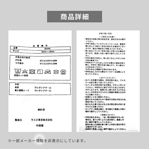 | 組成 | 【側地カバー】 がわ地・マチ部分:ポリエステル100% 【中材】 本体・高さ調整シート:ウレタンフォーム |