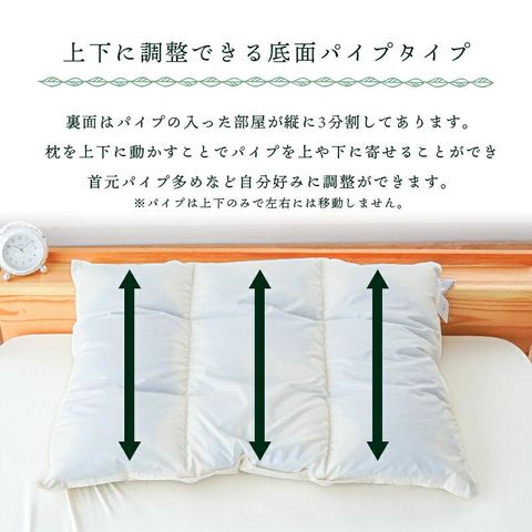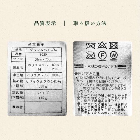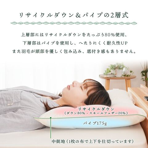 | ・「環」シリーズ 地球温暖化や海洋プラスチック問題など環境問題は年々深刻化し、過去たくさん作ってたくさん捨てる時代には考えもしなかった問題がでてきています。 様々な問題を作送りして未来の子供たちに押し付けることはできないと考え、作るものの責任として、捨てることを少なくするためにサイクルダウンを採用しました。 リサイクルという言葉に忌避感がある方もいらっしゃると思いますが、丁寧に洗いきちんと乾燥させ、除塵を行うと羽毛はまさしく蘇ります。私たちが実際にたくさんの羽毛ふとんを洗った素直な感想です。 ダウン独特の動物臭もほとんど感じませんので、においに敏感な方にもおすすめいたします。 少しでも資源を循環することにより循環型社会、ひいては地球環境に貢献できればと考えます。 ・リサイクルダウン羽毛は再生可能な資源なのでリサイクルダウンとして再利用できます。 「リサイクル」と聞くと清潔ではないのではないかと感じられるかもしれません。しかし、新毛よりもリサイクルダウンの方が、洗浄の回数が多く、清潔で臭いの少ないダウンに仕上がります。 ・国内の自社工場で製造しています。お客様に安心していただける商品をお届けするため、ダウンピローの中材となるダウンの充填から側生地の縫製、梱包・出荷まで当店のスタッフが手作業で行っています。 ・ふっくらダウン85%洗浄した清潔なリサイクルダウンを使用。ダウン85%のふっくらとした弾力は、頭や頸椎に負担をかけず、自然な寝心地が得られます。 ・リサイクルダウン&パイプの2層式上層部にはリサイクルダウンをたっぷり85%使用、下層部はパイプを使用し、へたりにくく耐久性をUP。また羽毛が頭部を優しく包み込み、底付き感もありません。 ・上下に調整できる底面パイプタイプ裏面はパイプの入った部屋が縦に3分割してあります。。枕を上下に動かすことでパイプを上や下に寄せることができ首元パイプ多めなど自分好みに調整ができます。 | |