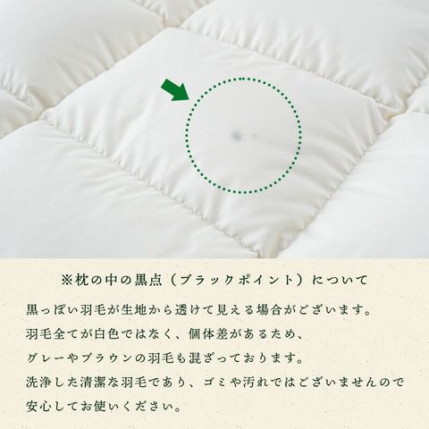 ・側地の傷みや汚れを防ぐため、枕カバーを掛けてお使いください。 ・小さな穴でも羽毛が飛び出しますので、絶対に針や、安全ピンを通さないでください。 ・ふとん側地や縫い目などから多少羽毛が出てくることがありますが、使用上問題ありません。 ・臭いが気になる場合は、枕を折り畳んで臭気を押し出し、新しい空気と入れ換えて、3~4時間日に干してからお使いください。 |