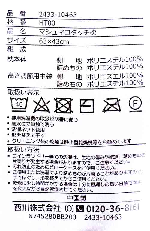 | 組成 | ・枕本体 側地:ポリエステル100% 詰めもの:ポリエステル100%(マイクロファイバーわた:750g) ・高さ調節用中袋 側地:ポリエステル100% 詰めもの:ポリエステル100%(粒わた:100g) |