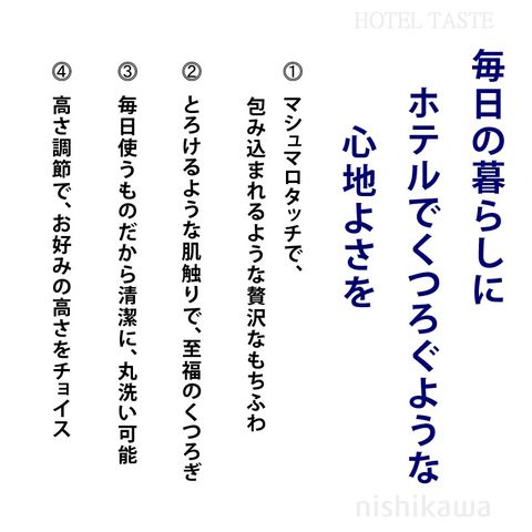 ・マシュマロタッチ ・マチ付き ・高さ調節用中袋 ・洗濯機で丸洗い可能 ・安心の西川製品 |