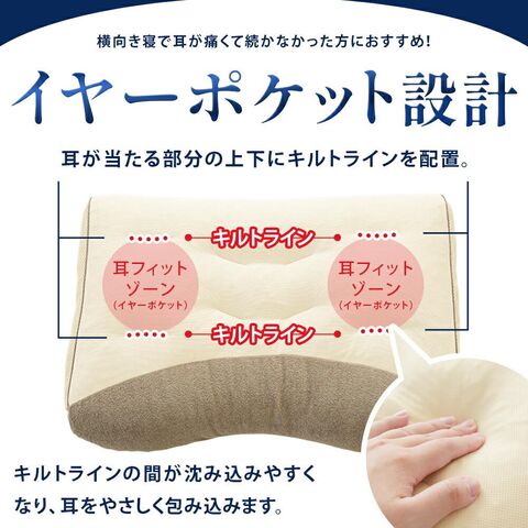 西川「横寝上手枕」は、横向き寝の際に感じる耳の圧迫感を軽減するイヤーポケットを備えた機能性枕です。 |