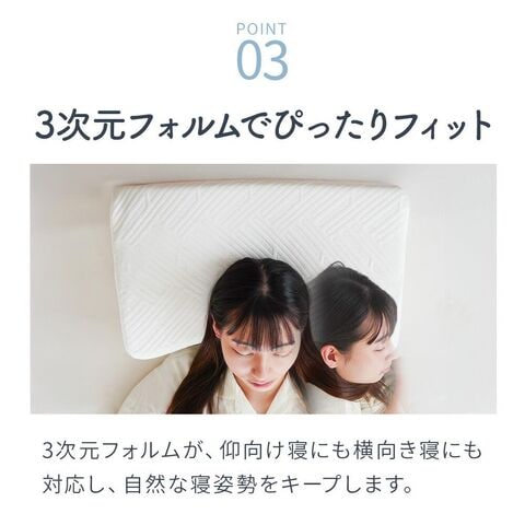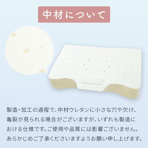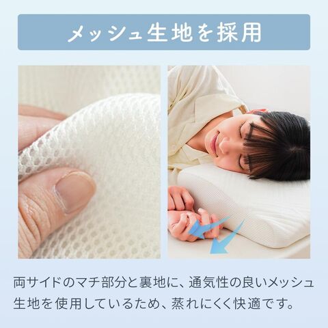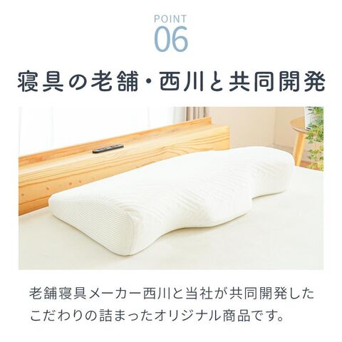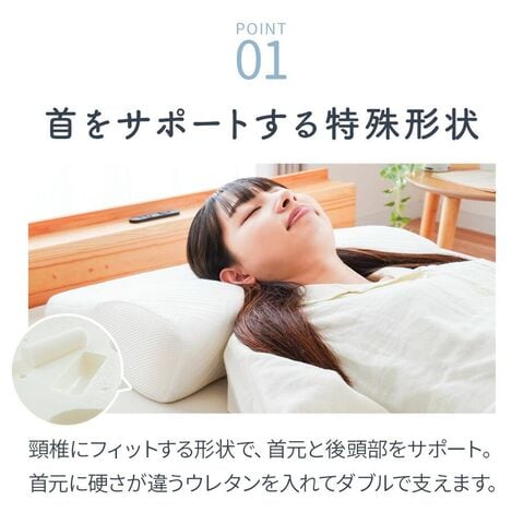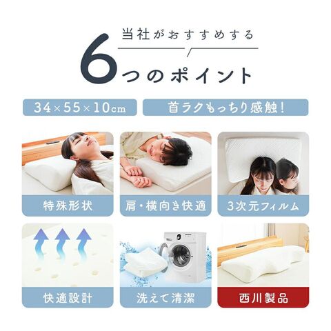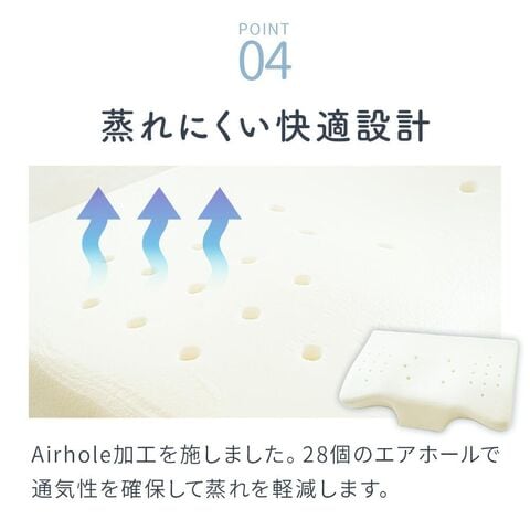| POINT 01 首をサポートする特殊形状 頸椎にフィットする形状で、首元と後頭部をサポート。首元に硬さが違うウレタンを入れてダブルで支えます。 POINT 02 肩口・横向き寝をサポート肩口にフィットする形状と両サイドの高さで、肩口と横向き寝をしっかりサポート。 POINT 03 3次元フォルムでぴったりフィット3次元フォルムが、仰向け寝にも横向き寝にも対応し、自然な寝姿勢をキープします。 POINT 04 蒸れにくい快適設計Airhole加工を施しました。28個のエアホールで通気性を確保して蒸れを軽減します。 メッシュ生地を採用両サイドのマチ部分と裏地に、通気性の良いメッシュ生地を使用しているため、蒸れにくく快適です。 POINT 05 洗濯機で洗えて清潔洗える側地なので、いつでも気軽に洗えて清潔。 ※お洗濯の際は必ず洗濯ネットを使用してください。 ※材料のウレタンフォームは洗えません。 POINT 06 寝具の老舗・西川と共同開発老舗寝具メーカー西川と当社が共同開発したこだわりの詰まったオリジナル商品です。 | |