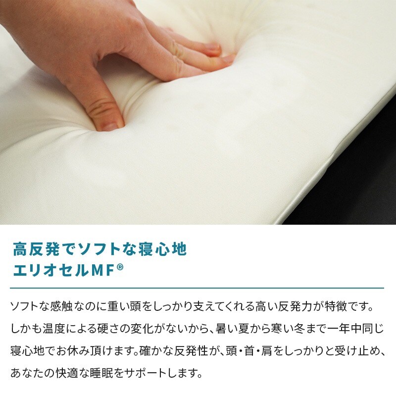 芯材「エリオセルMF」は、ソフトな感触なのに重い頭をしっかり支えてくれる高い反発力が特徴。